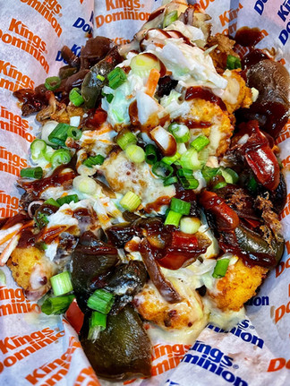 Loaded Cheese Curds - Topped with caramelized onions, coleslaw, green onions, and a BBQ drizzle. Definitely one of my favorites of the bunch...would 100% order again! Can find at Dasher's Diner (Dogwood Cafe). $14.99